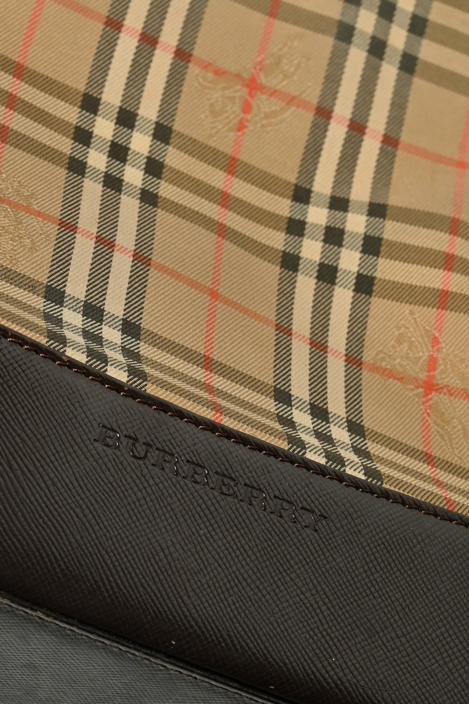 Condition Description: Great condition with some signs of wear. Haymarket check fabric damaged where bag has naturally folded over time. Leather straps cracking at bag where they have bended with consistent use.