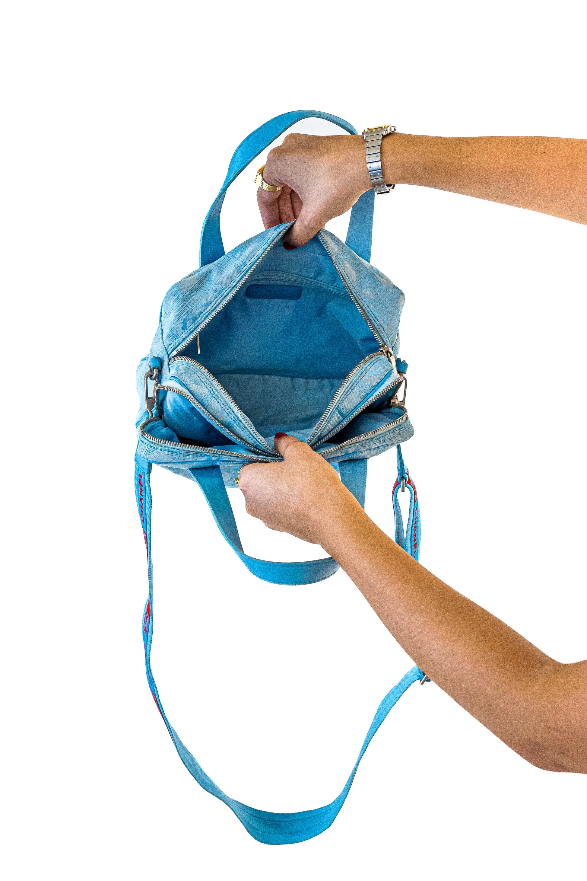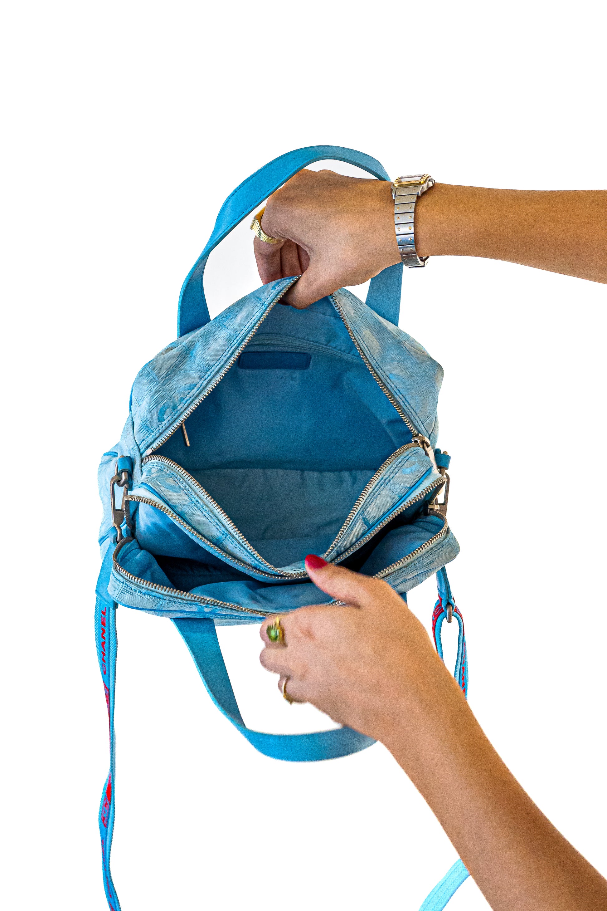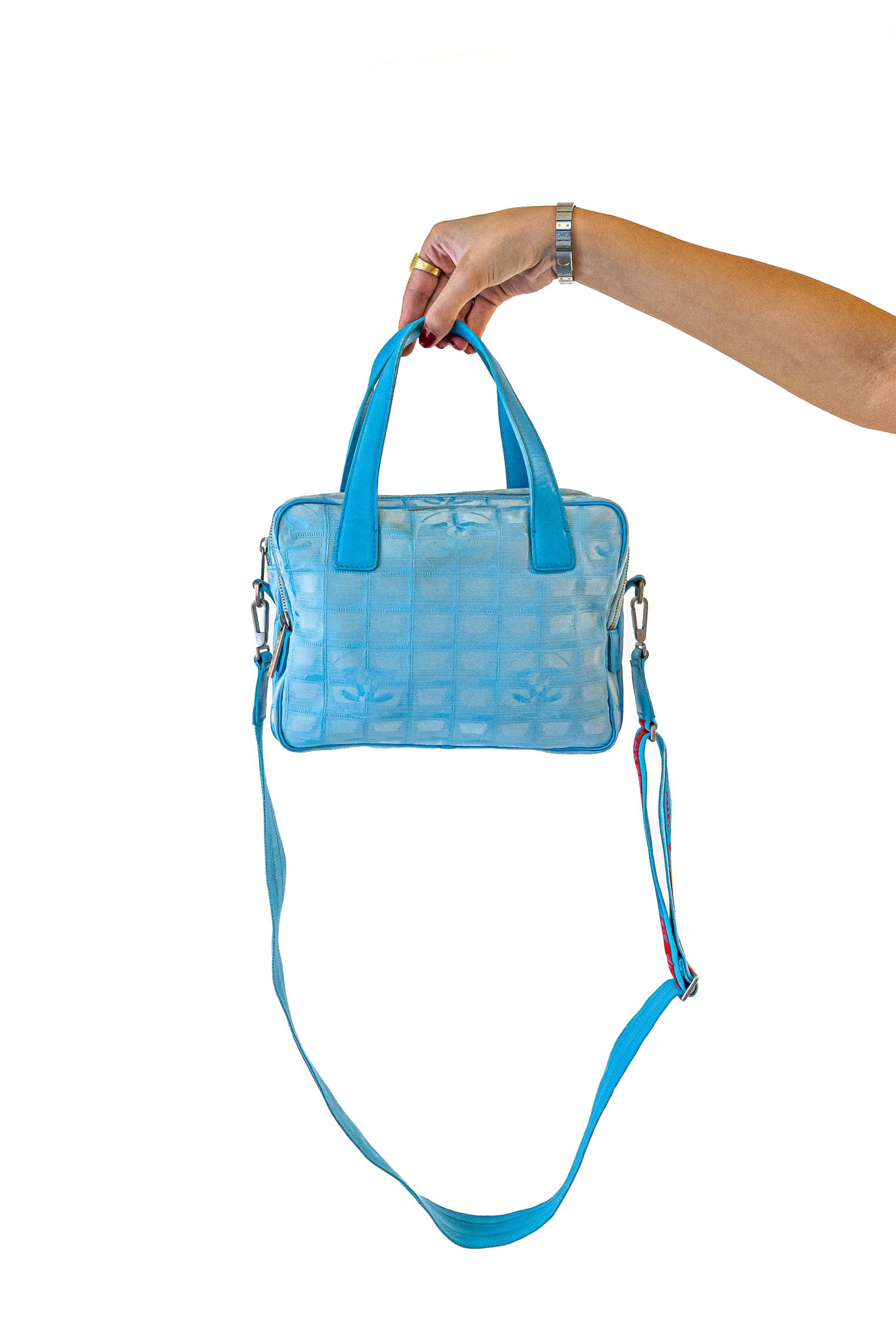 - Crafted from blue jacquard nylon, this travel bag from Chanel is beautiful. It comes with top handles and an adjustable canvas shoulder strap.